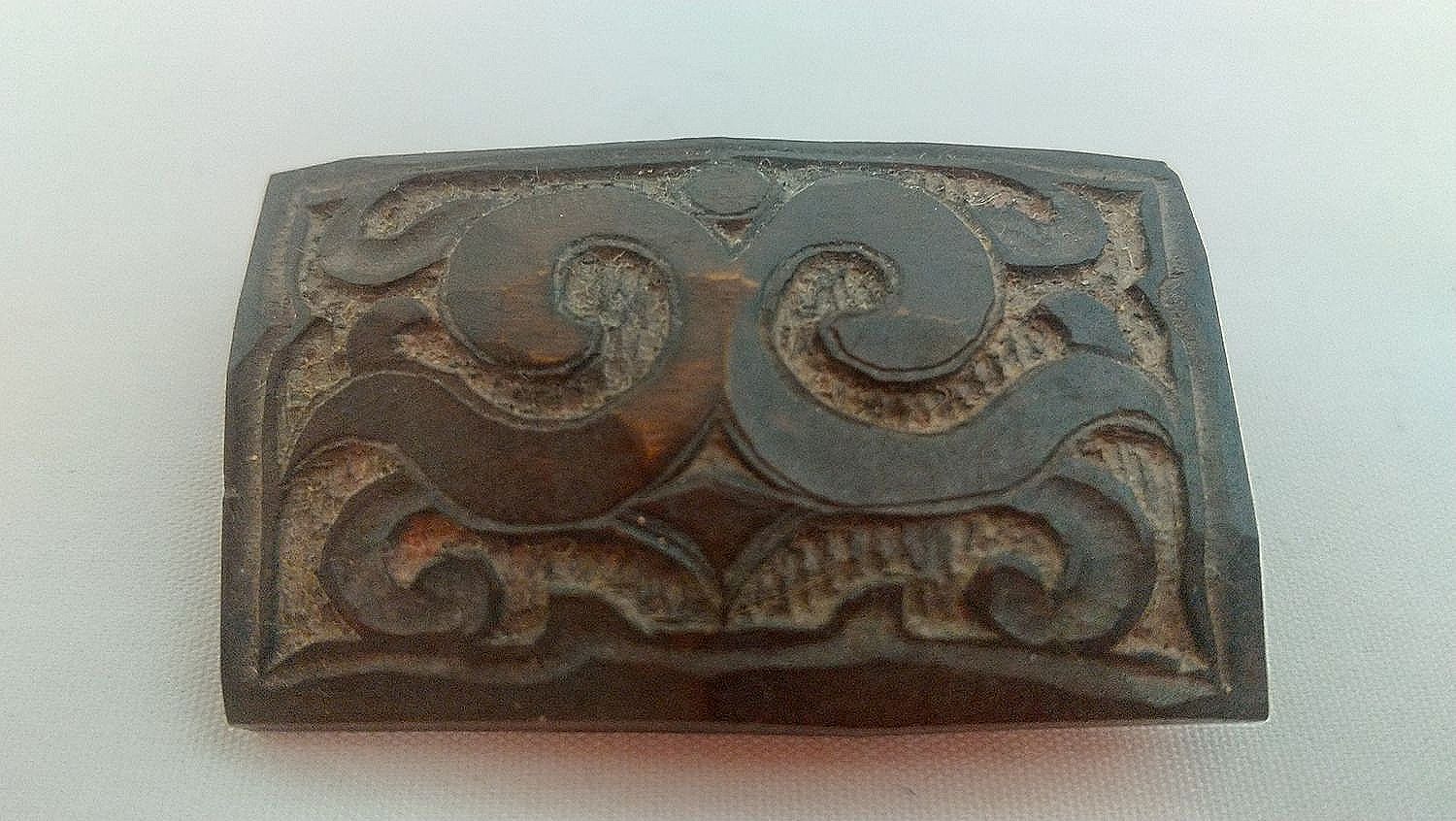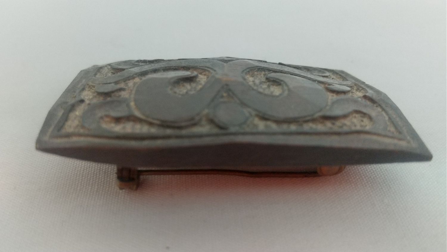 アイヌ文様のブローチ サイズ:2.6×4.3×0.8㎝ 制作:1975年 材質:ツリバナ(エリマキ)