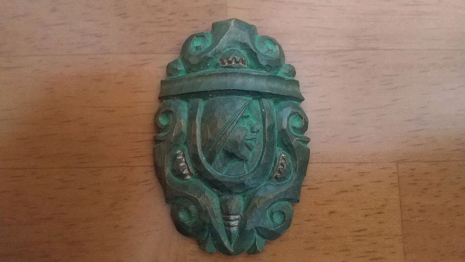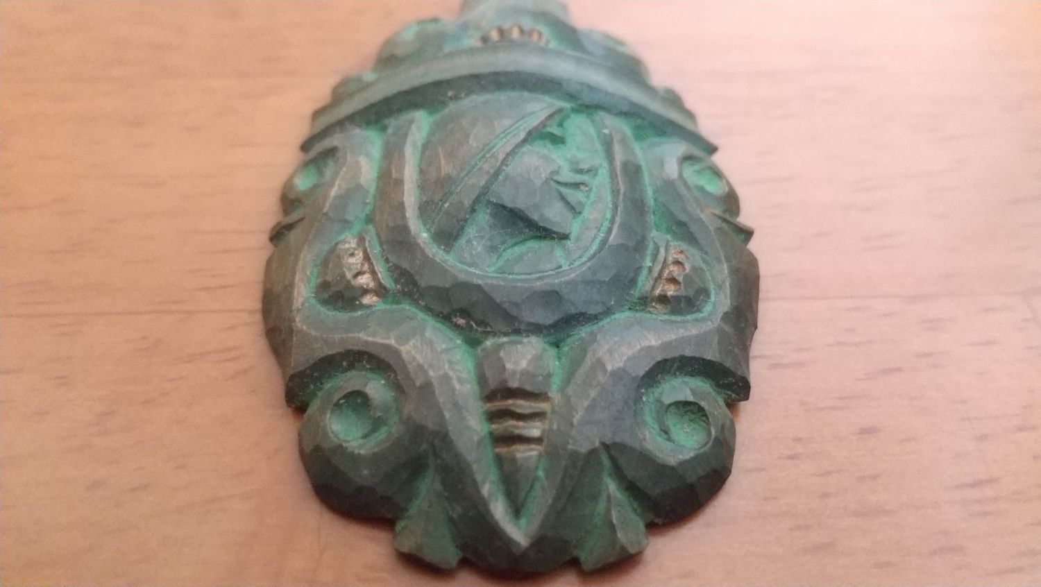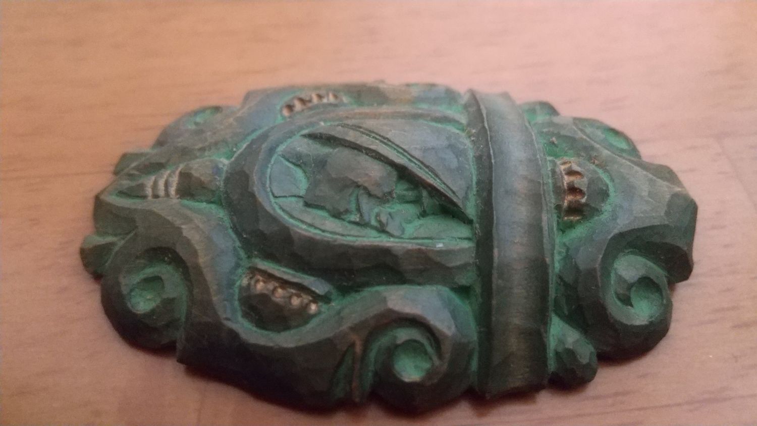 アイヌ文様と右向きメノコ像のアクセサリー サイズ:5.4×3.6×0.9㎝ 制作:1980年代 材質:ツリバナ(エリマキ)