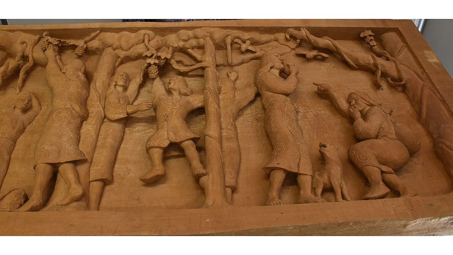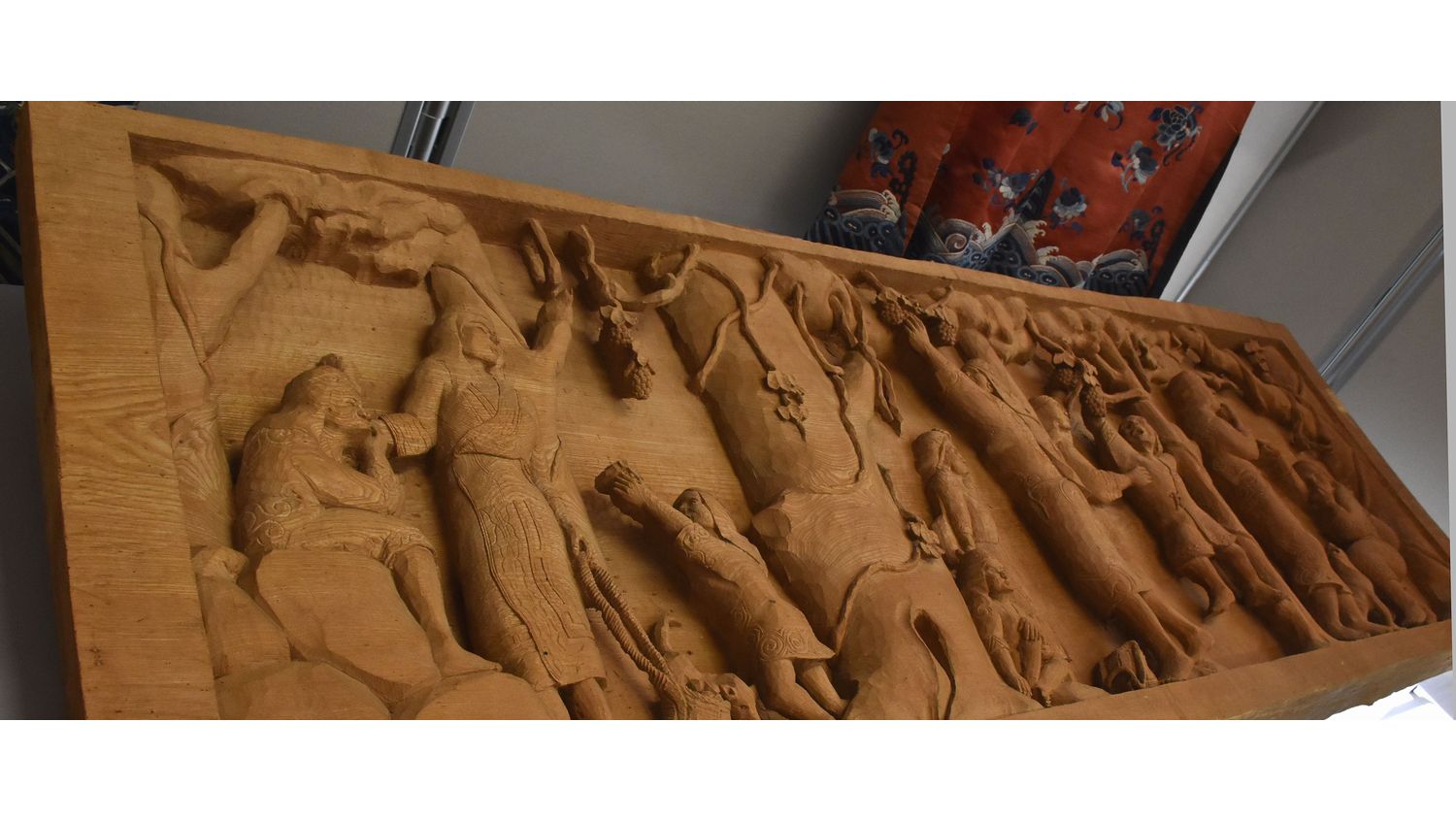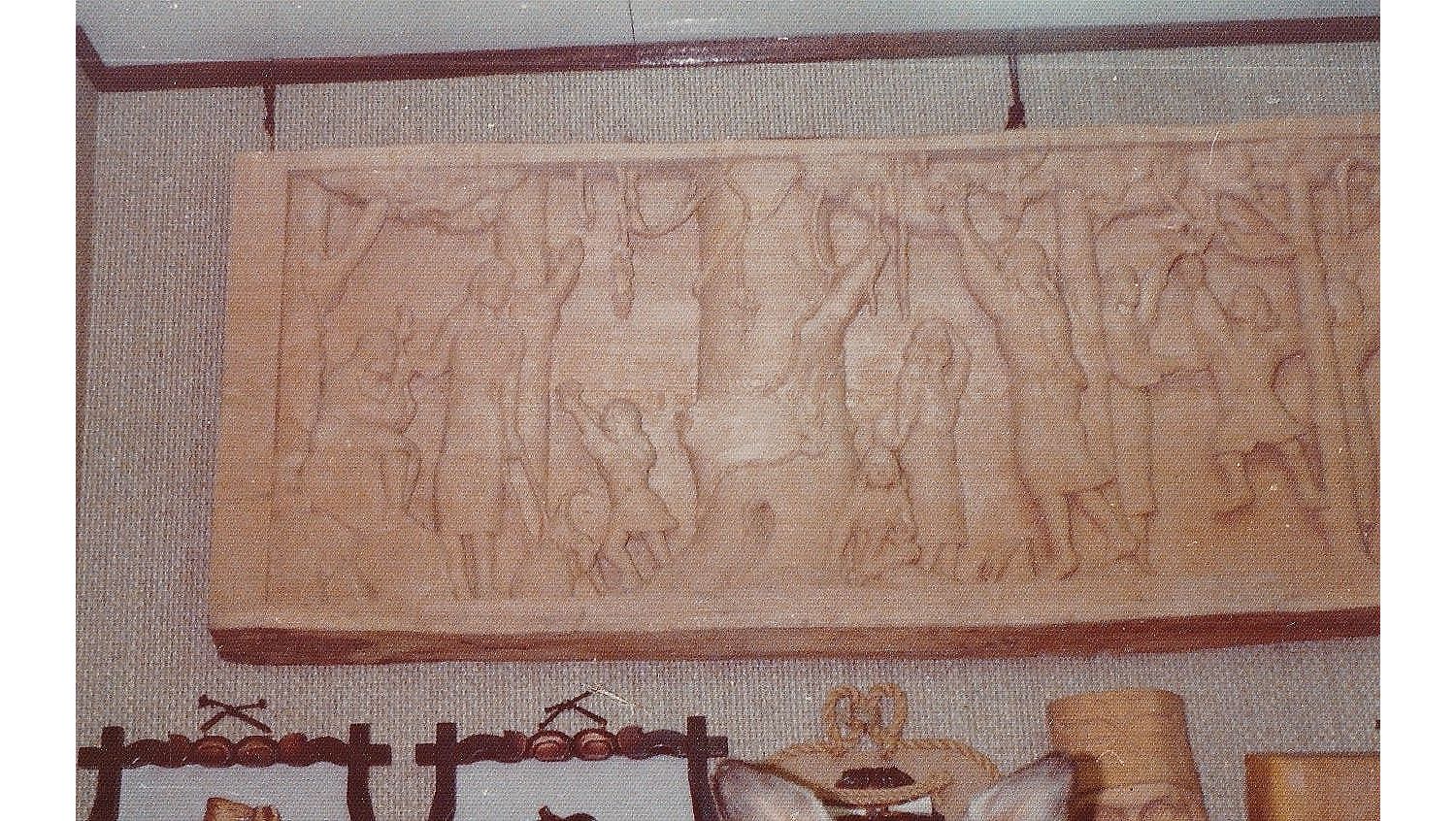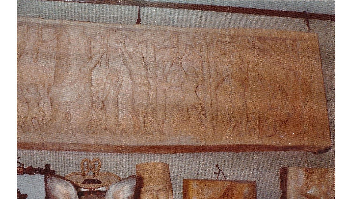 豊かな自然の暮らしの一コマを刻んだ大きなレリーフ 制作:1970年代 材質:栓 北海道釧路市 中野様所蔵