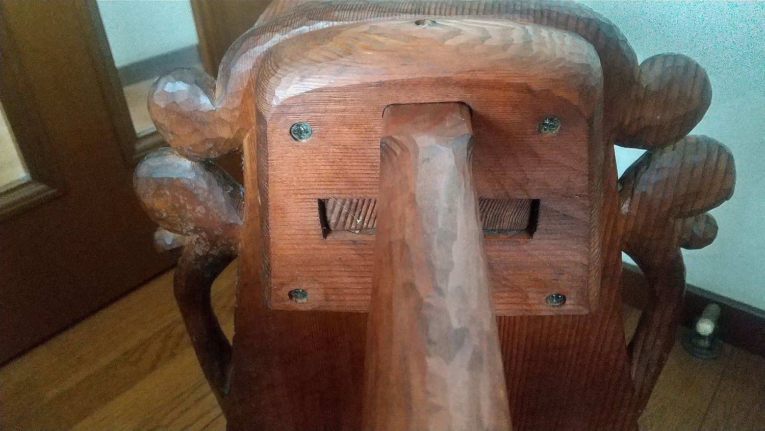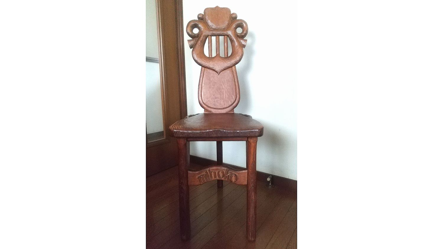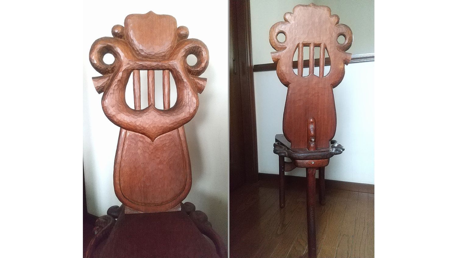3本脚の椅子 背板にハープのモチーフ オーダーメイド サイズ:93.0×30.2×48.5㎝ 座面までの高さ42.3㎝ 制作:1981年 東京都 稲葉様所蔵